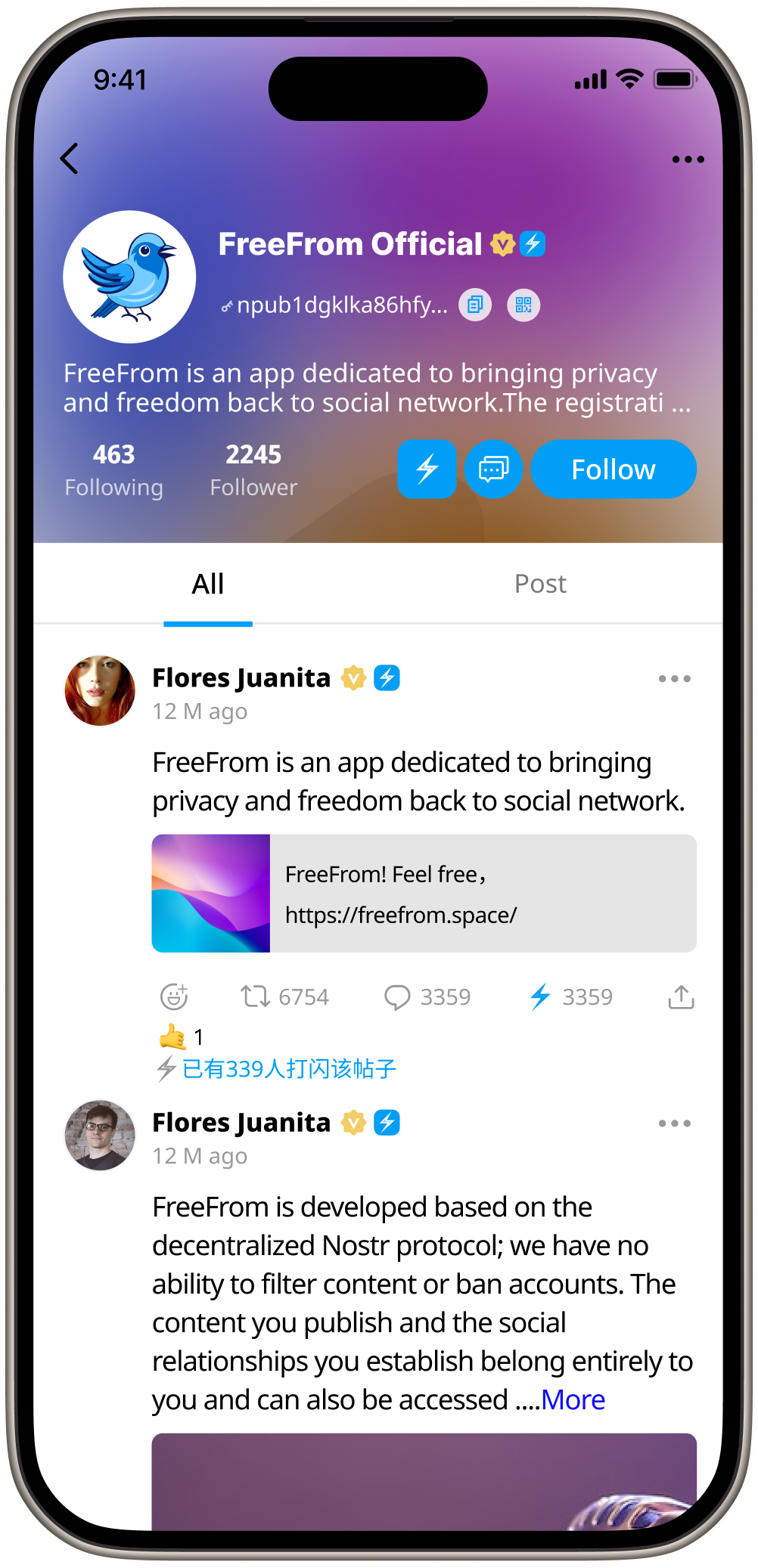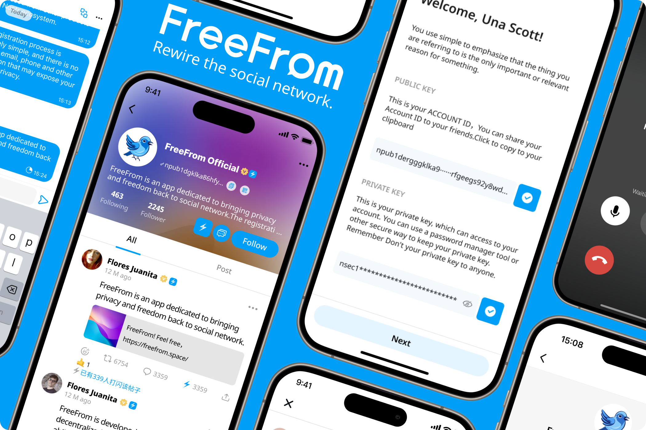FreeFrom is an app dedicated to bringing privacy and free speech back to SNS, developed based on the decentralized Nostr protocol, where all content you post and social relationships you build belong to you, and your account is free to You can migrate your account freely within the Nostr community.