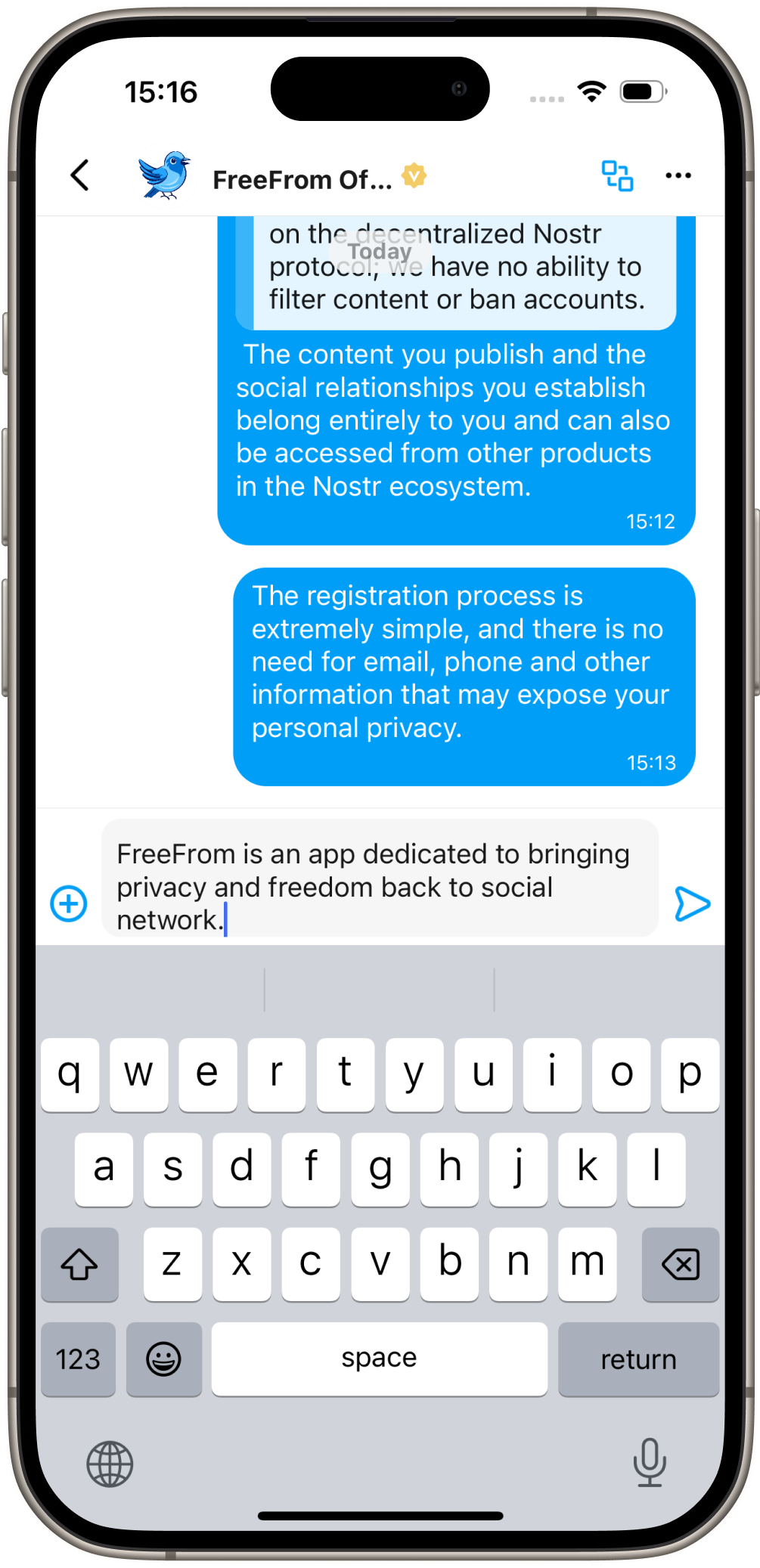 The sign up for a FreeFrom account does not require a phone number or email address, ensuring that your identifying information is completely anonymous. No one except you knows who you are, and no one can delete your content or block your account.FreeFrom uses the most thoroughly decentralized Nostr protocol, which does not rely on any central server, and consists of client and relay nodes, providing the highest level of protection for your privacy and security.